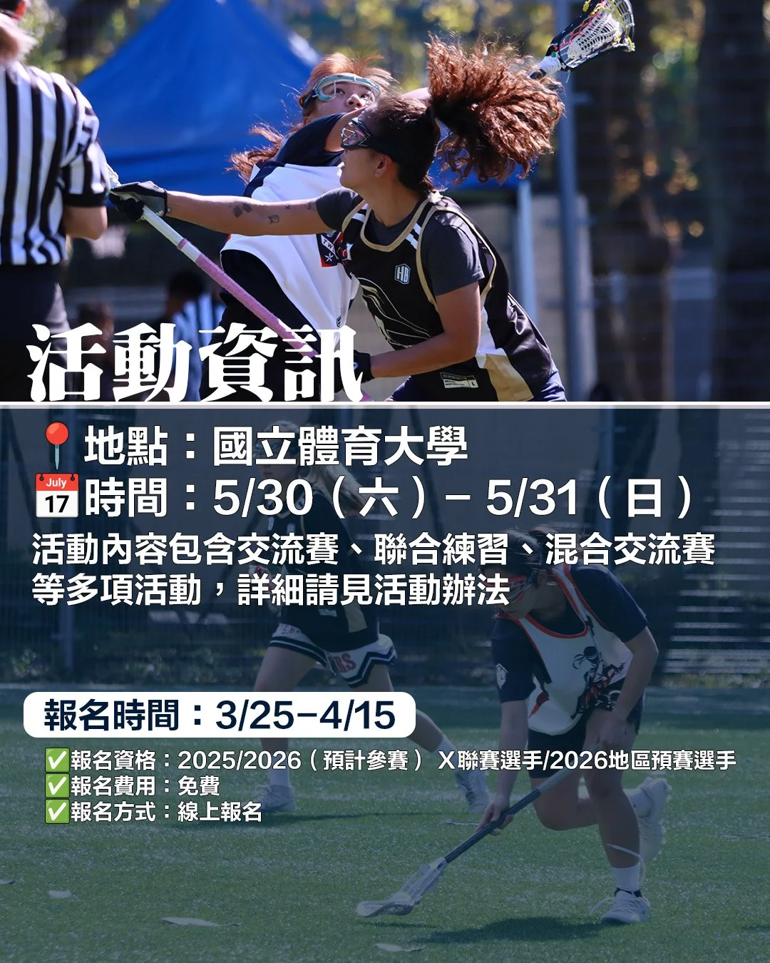 香港HPP培訓隊女子袋棍球交流賽 - Sixes 活動資訊 主辦單位:社團法人中華民國袋棍球運動協會 活動地點: 國立體育大學(333桃園市龜山區文化一路250號) 活動日期:05/30(六)至 05/ 31 (日)報名時間:3/25 -4/15詳細資訊詳見活動辦法 報名連結 活動辦法 近期活動吳 敏銓March 23, 2026 Facebook0 Twitter LinkedIn0 Reddit Tumblr Pinterest0 0 Likes